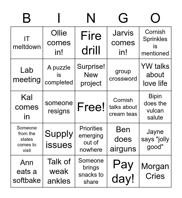 This bingo card has a free space and 24 words: Ann eats a softbake, Supply issues, Surprise! New project, Pay day!, Cornish Sprinkles is mentioned, IT meltdown, Ollie comes in!, Fire drill, Cornish talks about cream teas, Bipin does the vulcan salute, Kal comes in, A puzzle is completed, Ben does airguns, Jayne says "jolly good", Lab meeting, Talk of weak ankles, Someone brings snacks to share, Jarvis comes in!, YW talks about love life, Someone from the states comes to visit, someone resigns, Priorities emerging out of nowhere, group crossword and Morgan Cries.