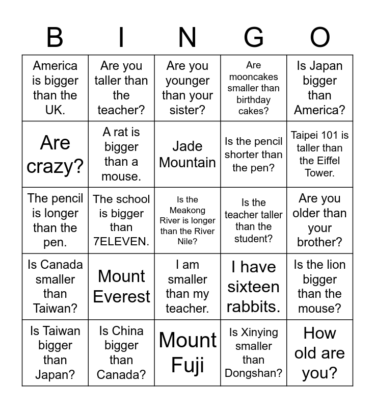 This bingo card has 25 words: Mount Everest, Mount Fuji, Jade Mountain, Is Taiwan bigger than Japan?, Is Japan bigger than America?, America is bigger than the UK., Are crazy?, Are you taller than the teacher?, Is the teacher taller than the student?, I am smaller than my teacher., Is the pencil shorter than the pen?, The pencil is longer than the pen., I have sixteen rabbits., Is the lion bigger than the mouse?, A rat is bigger than a mouse., How old are you?, Are you older than your brother?, Are you younger than your sister?, Taipei 101 is taller than the Eiffel Tower., The school is bigger than 7ELEVEN., Is the Meakong River is longer than the River Nile?, Is China bigger than Canada?, Is Canada smaller than Taiwan?, Are mooncakes smaller than birthday cakes? and Is Xinying smaller than Dongshan?.