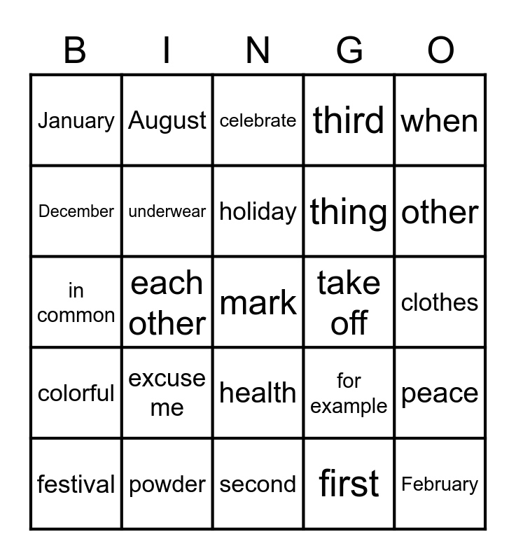 This bingo card has a free space and 24 words: excuse me, powder, holiday, festival, when, January, December, August, take off, health, thing, in common, for example, peace, underwear, first, clothes, celebrate, other, each other, February, colorful, third and second.