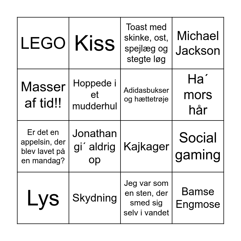 This bingo card has 20 words: Social gaming, Og så går jeg ind i sofaen og er en god dreng, Toast med skinke, ost, spejlæg og stegte løg, Dota, Lys, Masser af tid!!, Skydning, LEGO, Er det en appelsin, der blev lavet på en mandag?, Kiss, Jonathan gi´ aldrig op, Kajkager, Hoppede i et mudderhul, Bamse Engmose, Adidasbukser og hættetrøje, Lynet McQueen, Ha´ mors hår, Michael Jackson, Jeg var som en sten, der smed sig selv i vandet and Spejder.