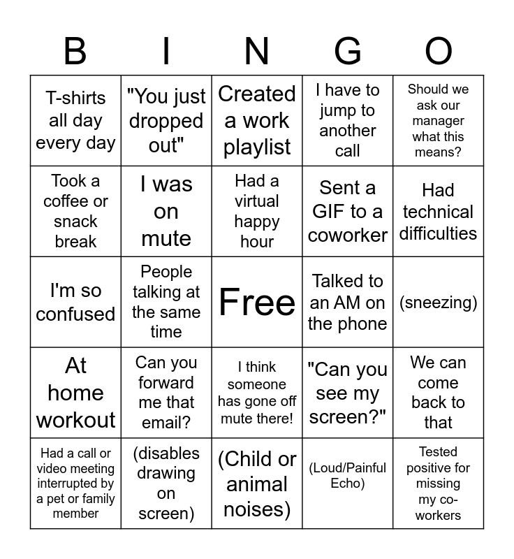 This bingo card has a free space and 77 words: "Can you hear me?", Put pants on before dialing, Created a work playlist, Sent a bitmoji/emoji in an email, Did household chores on your "lunch break", Discovered a new snack, I have to jump to another call, Slept in late, Showed a pet on a video call, Netflix and lunch, Had a call or video meeting interrupted by a pet or family member, Drank a glass of water, Talked to an AM on the phone, Had technical difficulties, Talked to someone outside of bathroom, I was on mute, Took an online quiz #buzzfeed, "Can you see my screen?", Wore PJ's all day, Took a coffee or snack break, At home workout, Had a virtual happy hour, Sent a GIF to a coworker, Should we ask our manager what this means?, T-shirts all day every day, Coronavirus, Unlimited bathroom breaks, Nah, you go first, I'll be right back, Eat all my emergencey snacks, Coffee and More Coffee, Is there a test for ____?, "... you're on mute!", We can come back to that, I'm so confused, "You just dropped out", (Sound of a vacuum), Movie reference someone doesn't understand, (sneezing), At home workout, I hadn't really thought about that, Let me think about that, I'll update the screens, Teams virtual background, Stop drawing on my screen, (disables drawing on screen), Uh, ___ you're still sharing..., I have to jump to another call, (Sound of someone typing), ___ has joined the meeting, (Coughing sound), (Child or animal noises), Can you hear me?, Is anyone back?, Is everyone here?, Waiting in the zoom lobby, I was on mute, We need to fix line ___, Can you see my screen?, Awkward Silence......, People talking at the same time, Sorry, I was having connection issues, Put pants on before dialling, How is this supposed to work?, Should we ask ___?, Did we forget ____?, News and lunch, (Loud/Painful Echo), Seeing Colleague's bedroom, When VPN or Global Protect doesn't like you, Driving/Traffic sounds, I think someone has gone off mute there!, Spotify, Tested positive for missing my co-workers, Virtual kitchen runs all day, Can you forward me that email? and Late to work even if its work from home.