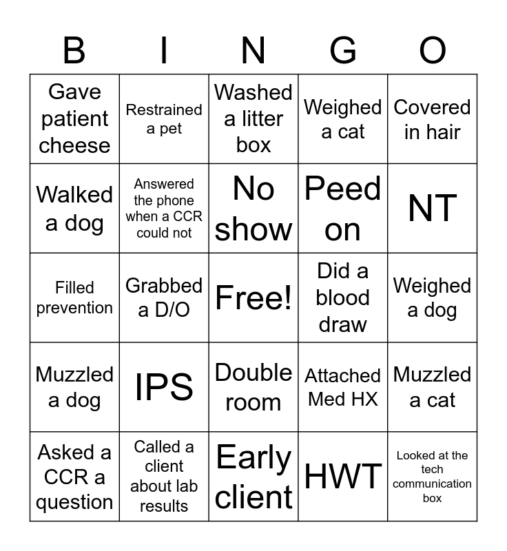 This bingo card has a free space and 24 words: IPS, Called a client about lab results, No show, Asked a CCR a question, Covered in hair, Gave patient cheese, Walked a dog, Restrained a pet, Did a blood draw, Double room, Peed on, Filled prevention, Attached Med HX, Muzzled a cat, Answered the phone when a CCR could not, HWT, Weighed a dog, Washed a litter box, NT, Grabbed a D/O, Looked at the tech communication box, Muzzled a dog, Weighed a cat and Early client.