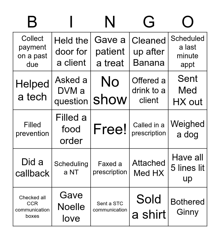 This bingo card has a free space and 24 words: Scheduling a NT, Gave Noelle love, No show, Checked all CCR communication boxes, Scheduled a last minute appt, Collect payment on a past due, Helped a tech, Held the door for a client, Called in a prescription, Faxed a prescription, Offered a drink to a client, Filled prevention, Attached Med HX, Have all 5 lines lit up, Asked a DVM a question, Sold a shirt, Weighed a dog, Gave a patient a treat, Sent Med HX out, Filled a food order, Bothered Ginny, Did a callback, Cleaned up after Banana and Sent a STC communication.