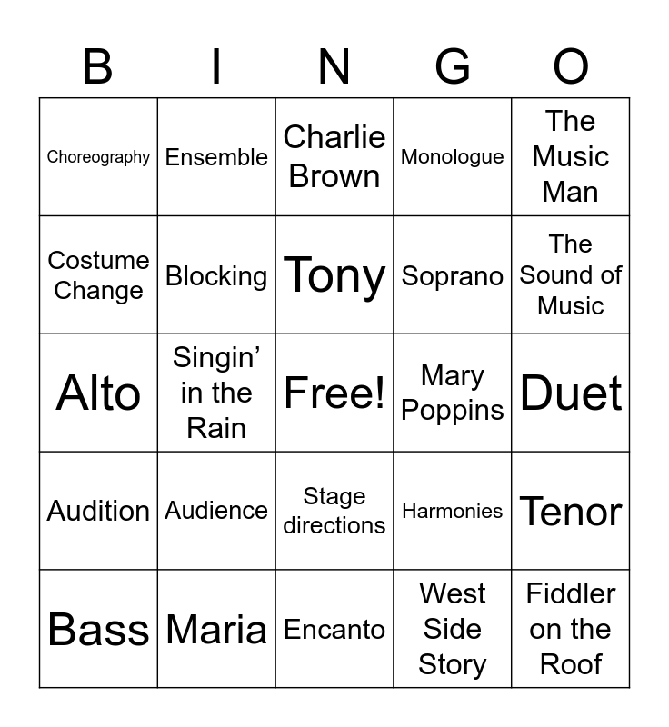 This bingo card has a free space and 26 words: Stage directions, West Side Story, Tony, Maria, The Music Man, Choreography, Costume Change, Ensemble, Duet, Harmonies, Soprano, Alto, Tenor, Bass, Singin’ in the Rain, Wicked, Monologue, Audition, Charlie Brown, Fiddler on the Roof, The Sound of Music, Encanto, Mary Poppins, Audience, Blocking and High School Musical.