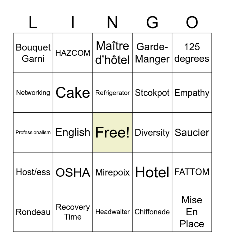 This bingo card has a free space and 24 words: OSHA, Recovery Time, Refrigerator, Rondeau, 125 degrees, Bouquet Garni, Networking, HAZCOM, Diversity, Mirepoix, Stcokpot, Professionalism, Hotel, FATTOM, Cake, Chiffonade, Saucier, Maître d’hôtel, Empathy, English, Mise En Place, Host/ess, Garde-Manger and Headwaiter.