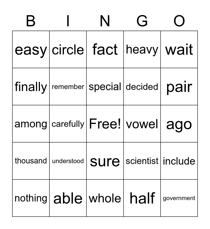 This bingo card has a free space and 30 words: able, behind, carefully, common, easy, fact, remember, sure, vowel, whole, ago, government, half, machine, pair, quickly, scientist, thousand, understood, wait, among, building, circle, decided, finally, heavy, include, nothing, special and wheel.