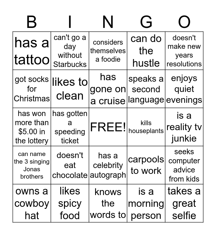 This bingo card has a free space and 24 words: doesn't eat chocolate, likes spicy food, has gone on a cruise, owns a cowboy hat, doesn't make new years resolutions, has a tattoo, got socks for Christmas, can't go a day without Starbucks, kills houseplants, has a celebrity autograph, speaks a second language, has won more than $5.00 in the lottery, carpools to work, seeks computer advice from kids, likes to clean, is a morning person, is a reality tv junkie, considers themselves a foodie, enjoys quiet evenings, has gotten a speeding ticket, takes a great selfie, can name the 3 singing Jonas brothers, can do the hustle and knows the words to.