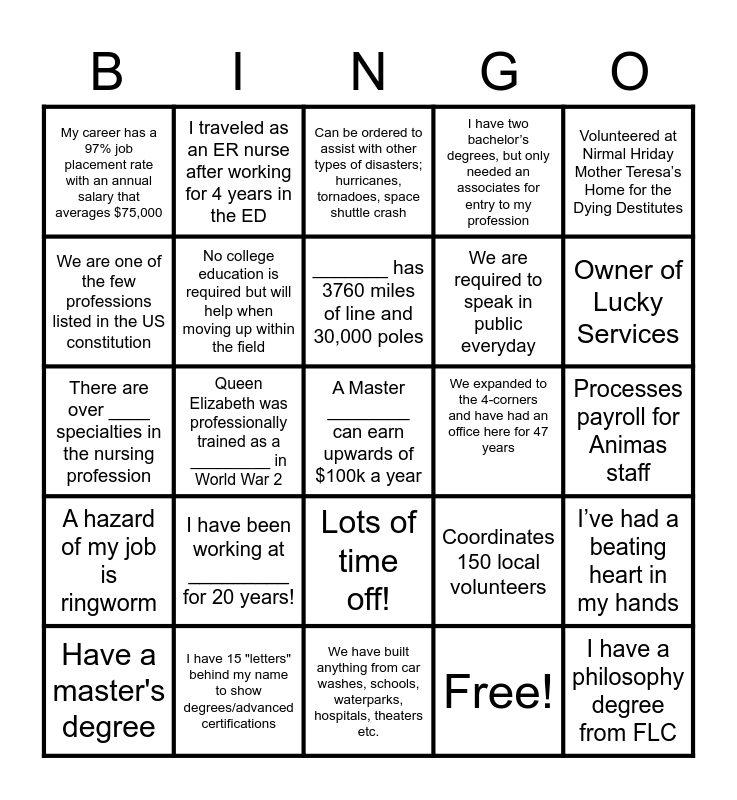 This bingo card has 30 words: I have 15 "letters" behind my name to show degrees/advanced certifications, I did a training class in Vegas all expenses paid for intercom training, Queen Elizabeth was professionally trained as a _________ in World War 2, I own the oldest privately-owned therapy clinic in Durango (26 years!), My career has a 97% job placement rate with an annual salary that averages $75,000, Can be ordered to assist with other types of disasters; hurricanes, tornadoes, space shuttle crash, No college education is required but will help when moving up within the field, Lots of time off!, We expanded to the 4-corners and have had an office here for 47 years, We have built anything from car washes, schools, waterparks, hospitals, theaters etc., Processes payroll for Animas staff, A Master ________ can earn upwards of $100k a year, Free!, I have a philosophy degree from FLC, Owner of Lucky Services, Worked at Mountain Middle School, Coordinates 150 local volunteers, A hazard of my job is ringworm, I have been working at _________ for 20 years!, Volunteered at Nirmal Hriday Mother Teresa’s Home for the Dying Destitutes, There are over ____ specialties in the nursing profession, I'm applying skills acquired through my 22 years in the fields of microbiology, chemistry, liquid and mechanical engineering, math, and language arts., I traveled as an ER nurse after working for 4 years in the ED, We are required to speak in public everyday, We are one of the few professions listed in the US constitution, I have two bachelor’s degrees, but only needed an associates for entry to my profession, I’ve had a beating heart in my hands, Have a master's degree, _______ has 3760 miles of line and 30,000 poles and Can work from home.
