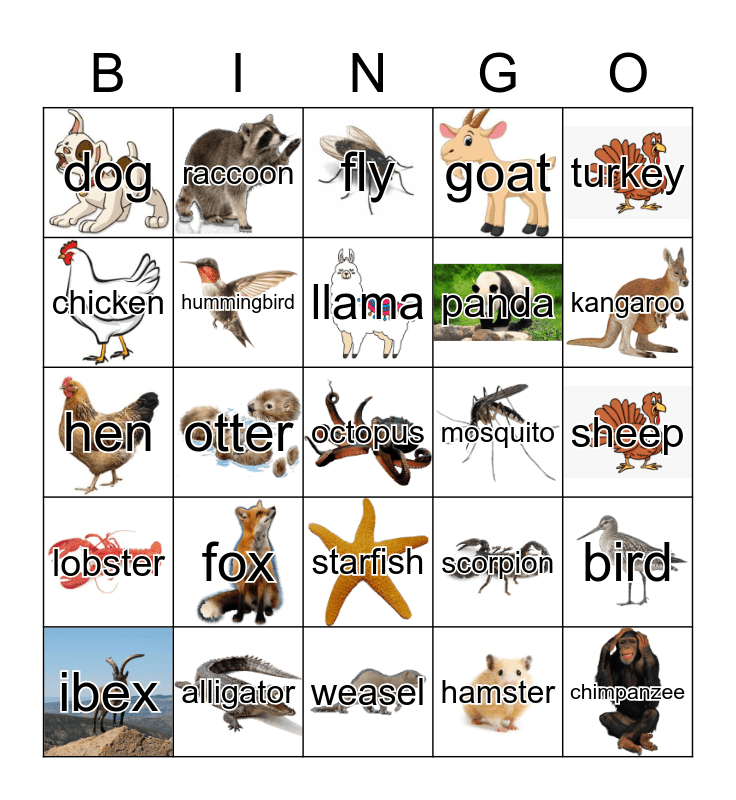 This bingo card has 79 images and 79 words: calf, cow, fly, bee, cat, butterfly, kitten, rabbit, duck, goldfish, goose, horse, goat, dog, dragonfly, chicken, donkey, fox, frog, sheep, fish, turkey, hen, llama, hummingbird, whale, jellyfish, killer whale, bird, ladybird, kangaroo, duck, weasel, chimpanzee, ibex, mosquito, moth, sheep, mouse, octopus, tortoise, owl, pig, hippopotamus, rabbit, raccoon, mouse, tiger, lizard, fish, bird, otter, scorpion, seal, shark, snail, snake, spider, squirrel, starfish, panda, swan, bird, turkey, lion, walrus, dolphin, wolf, camel, lobster, alligator, ant, monkey, zebra, rat, hamster, turtle, crocodile and dog.