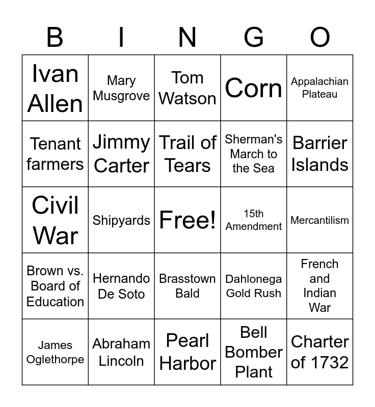 This bingo card has a free space and 24 words: Hernando De Soto, Abraham Lincoln, Trail of Tears, James Oglethorpe, Appalachian Plateau, Ivan Allen, Tenant farmers, Mary Musgrove, 15th Amendment, Brasstown Bald, Sherman's March to the Sea, Civil War, Dahlonega Gold Rush, French and Indian War, Jimmy Carter, Bell Bomber Plant, Mercantilism, Tom Watson, Barrier Islands, Shipyards, Charter of 1732, Brown vs. Board of Education, Corn and Pearl Harbor.