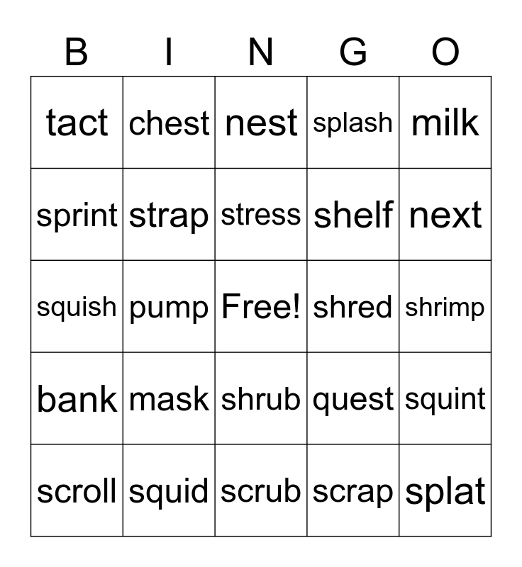 This bingo card has a free space and 24 words: mask, squid, stress, scroll, milk, tact, sprint, chest, shred, shrub, shelf, squish, quest, squint, strap, scrap, shrimp, nest, next, pump, splat, bank, splash and scrub.