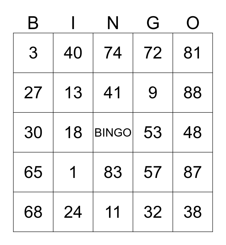 This bingo card has a free space and 24 words: 1, 24, 41, 68, 81, 3, 27, 40, 53, 83, 9, 30, 57, 87, 13, 32, 48, 74, 88, 18, 38, 65, 72 and 11.