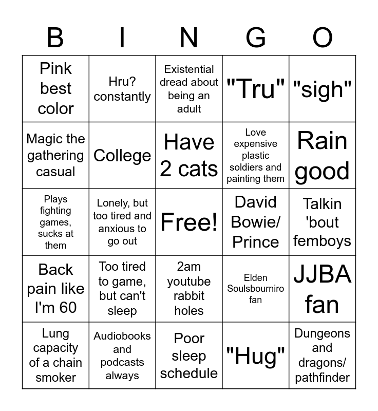 This bingo card has a free space and 24 words: Too tired to game, but can't sleep, Audiobooks and podcasts always, Have 2 cats, Lung capacity of a chain smoker, "sigh", Pink best color, Magic the gathering casual, Hru? constantly, David Bowie/ Prince, 2am youtube rabbit holes, Love expensive plastic soldiers and painting them, Plays fighting games, sucks at them, Elden Soulsbourniro fan, JJBA fan, College, "Hug", Talkin 'bout femboys, Existential dread about being an adult, Rain good, Lonely, but too tired and anxious to go out, Dungeons and dragons/ pathfinder, Back pain like I'm 60, "Tru" and Poor sleep schedule.