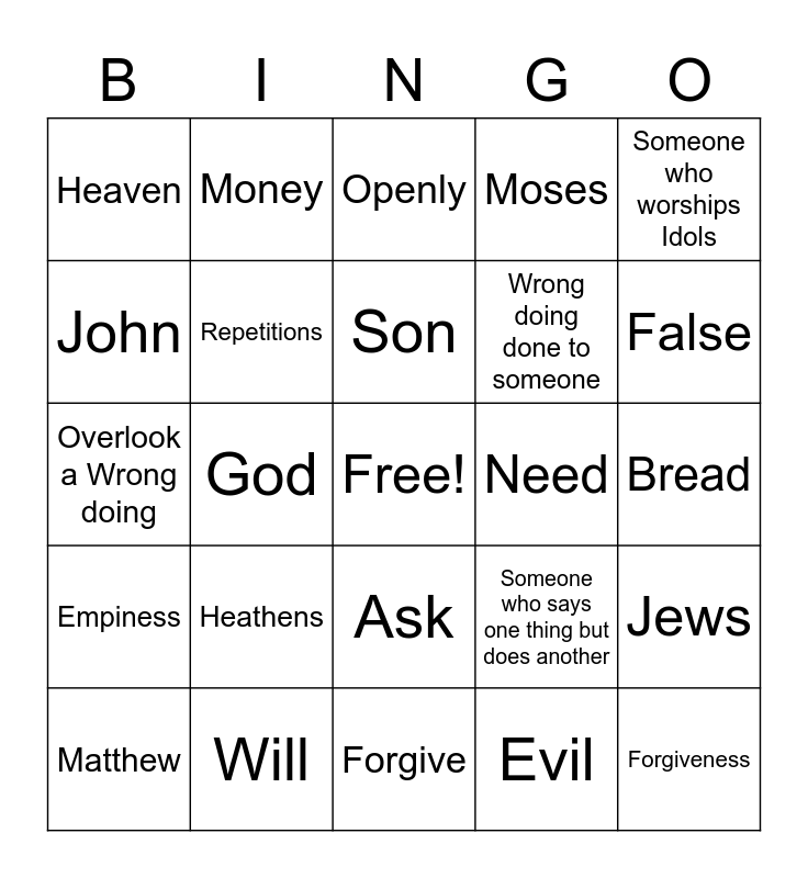 This bingo card has a free space and 29 words: Matthew, Jesus, God, Hypocrites, Heaven, Openly, Repetitions, Heathens, Need, Will, Bread, Forgiveness, Forgive, Evil, False, True, Ask, Empiness, Someone who worships Idols, Overlook a Wrong doing, Someone who says one thing but does another, Saying the same words over and over, Wrong doing done to someone, John, Moses, Money, Jews, Son and Pharisee's.