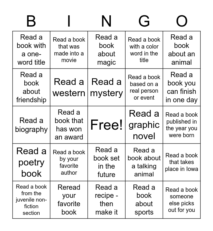 This bingo card has a free space and 24 words: Read a book by your favorite author, Reread your favorite book, Read a mystery, Read a book from the juvenile non-fiction section, Read a book about an animal, Read a book with a one-word title, Read a book about friendship, Read a book that was made into a movie, Read a graphic novel, Read a book set in the future, Read a book based on a real person or event, Read a biography, Read a book about a talking animal, Read a book that takes place in Iowa, Read a western, Read a book about sports, Read a book published in the year you were born, Read a book about magic, Read a book you can finish in one day, Read a book that has won an award, Read a book someone else picks out for you, Read a poetry book, Read a book with a color word in the title and Read a recipe - then make it.