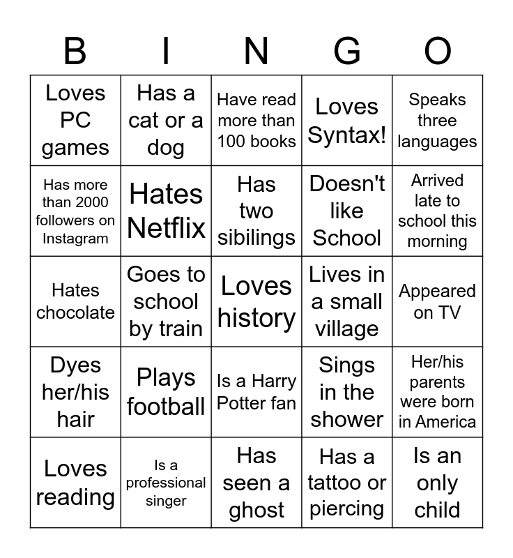 This bingo card has a free space and 24 words: Plays football, Is a professional singer, Has two sibilings, Loves reading, Speaks three languages, Loves PC games, Has more than 2000 followers on Instagram, Has a cat or a dog, Lives in a small village, Is a Harry Potter fan, Doesn't like School, Hates chocolate, Sings in the shower, Her/his parents were born in America, Hates Netflix, Has a tattoo or piercing, Appeared on TV, Have read more than 100 books, Arrived late to school this morning, Goes to school by train, Is an only child, Dyes her/his hair, Loves Syntax! and Has seen a ghost.