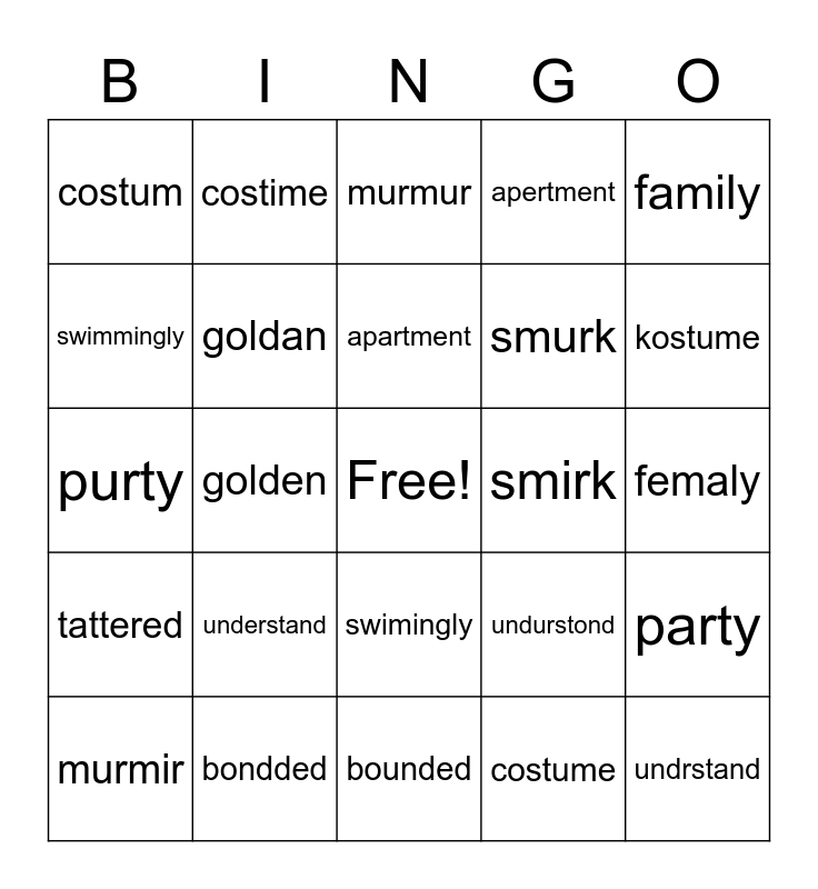 This bingo card has a free space and 24 words: understand, bondded, apartment, murmir, family, costum, swimmingly, costime, smirk, swimingly, smurk, purty, undurstond, party, goldan, costume, femaly, murmur, kostume, golden, undrstand, tattered, apertment and bounded.