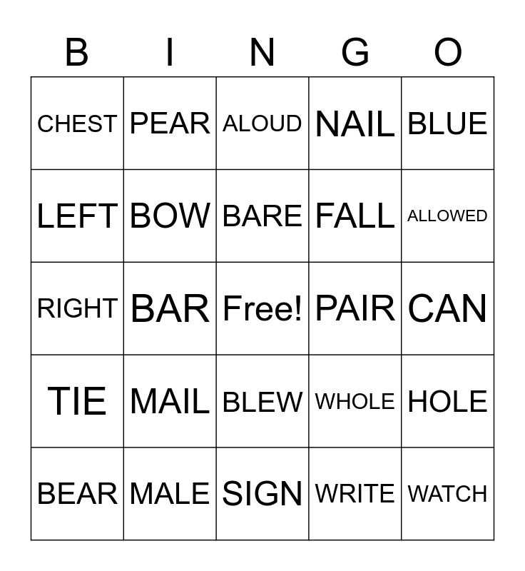 This bingo card has a free space and 24 words: MAIL, MALE, BARE, BEAR, BLUE, CHEST, LEFT, PEAR, PAIR, BLEW, FALL, RIGHT, WHOLE, HOLE, BOW, WRITE, CAN, ALOUD, ALLOWED, BAR, WATCH, TIE, NAIL and SIGN.