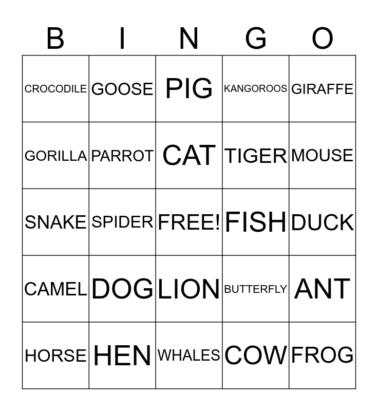 This bingo card has a free space and 24 words: DOG, HEN, CAT, HORSE, GIRAFFE, CROCODILE, GORILLA, GOOSE, FISH, LION, TIGER, SNAKE, BUTTERFLY, ANT, PARROT, COW, DUCK, PIG, MOUSE, SPIDER, FROG, CAMEL, KANGOROOS and WHALES.