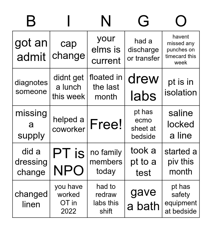 This bingo card has a free space and 24 words: PT is NPO, you have worked OT in 2022, floated in the last month, changed linen, havent missed any punches on timecard this week, got an admit, diagnotes someone, cap change, pt has ecmo sheet at bedside, no family members today, drew labs, missing a supply, took a pt to a test, started a piv this month, didnt get a lunch this week, gave a bath, saline locked a line, your elms is current, pt is in isolation, helped a coworker, pt has safety equipment at bedside, did a dressing change, had a discharge or transfer and had to redraw labs this shift.