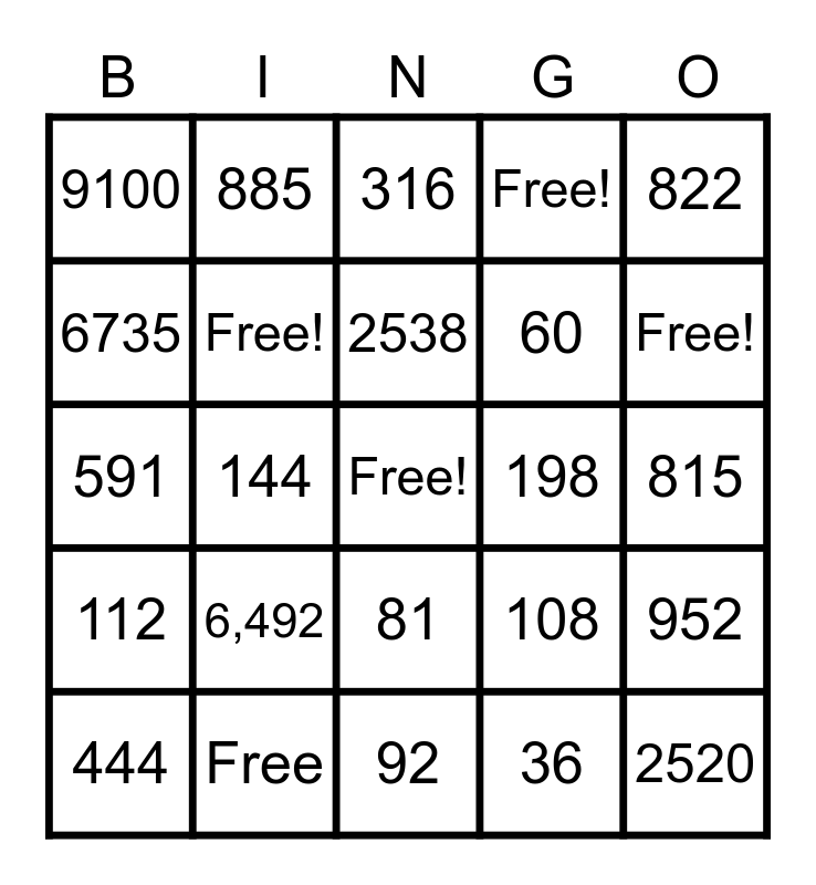 This bingo card has a free space and 24 words: 6,492, Free, 2538, 444, 822, 9100, 6735, 885, 198, 81, 60, 591, 108, 952, Free!, 36, 815, 316, Free!, 144, 2520, 112, Free! and 92.