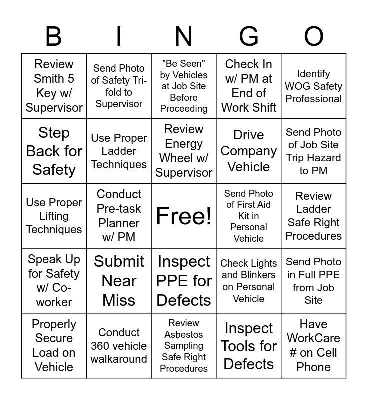 This bingo card has a free space and 24 words: Submit Near Miss, Conduct 360 vehicle walkaround, Review Energy Wheel w/ Supervisor, Properly Secure Load on Vehicle, Identify WOG Safety Professional, Review Smith 5 Key w/ Supervisor, Step Back for Safety, Send Photo of Safety Tri-fold to Supervisor, Send Photo of First Aid Kit in Personal Vehicle, Inspect PPE for Defects, Drive Company Vehicle, Use Proper Lifting Techniques, Check Lights and Blinkers on Personal Vehicle, Send Photo in Full PPE from Job Site, Use Proper Ladder Techniques, Inspect Tools for Defects, Review Ladder Safe Right Procedures, "Be Seen" by Vehicles at Job Site Before Proceeding, Send Photo of Job Site Trip Hazard to PM, Conduct Pre-task Planner w/ PM, Have WorkCare # on Cell Phone, Speak Up for Safety w/ Co-worker, Check In w/ PM at End of Work Shift and Review Asbestos Sampling Safe Right Procedures.