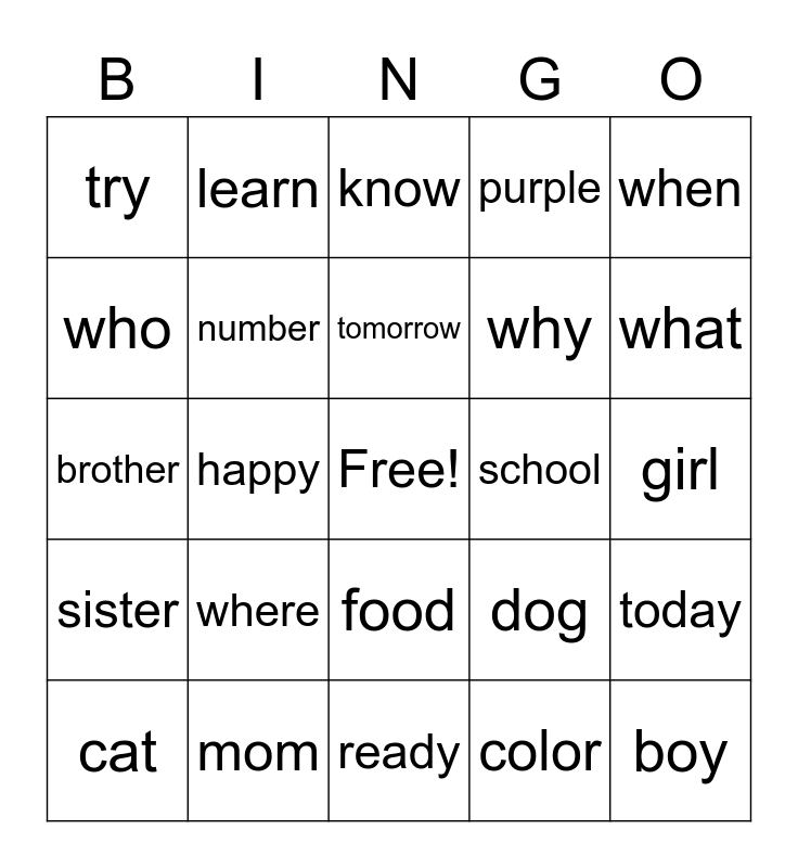 This bingo card has a free space and 24 words: where, mom, tomorrow, cat, when, try, who, learn, school, food, why, brother, dog, today, number, color, girl, know, what, happy, boy, sister, purple and ready.