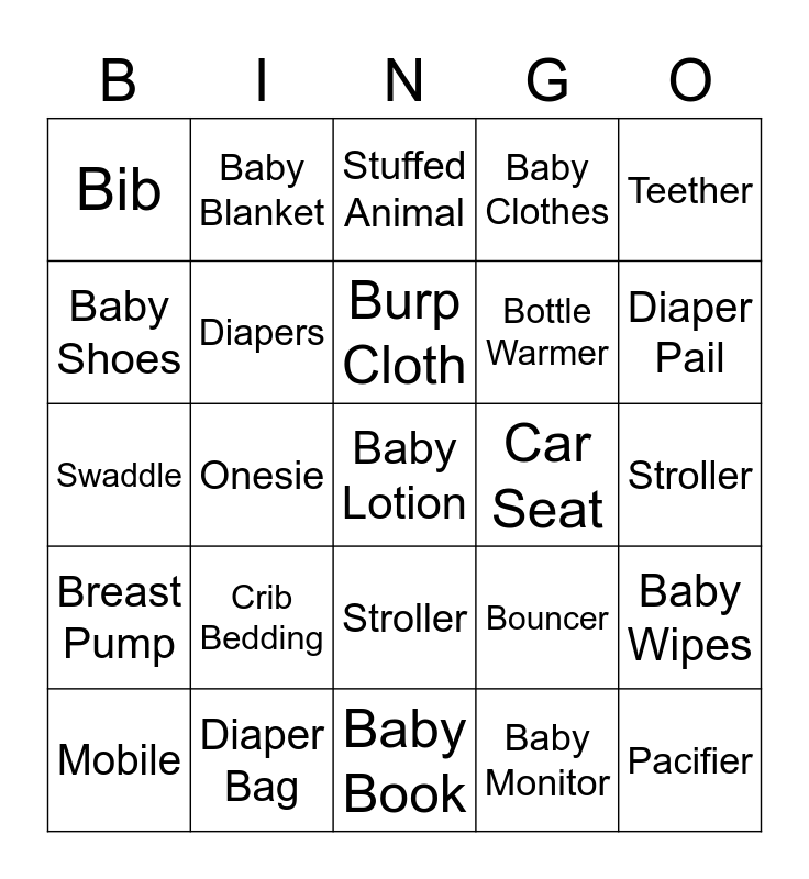 This bingo card has 29 words: Mobile, Night Light, Onesie, Pacifier, Bib, Stuffed Animal, Diapers, Crib Bedding, Car Seat, Diaper Bag, Stroller, Baby Lotion, Baby Book, Baby Monitor, Diaper Pail, Baby Powder, Stroller, Breast Pump, Teether, Swaddle, Bouncer, Changing Pad, Bottle Warmer, Baby Shoes, Baby Clothes, Baby Blanket, Baby Wipes, Burp Cloth and Baby Shoes.