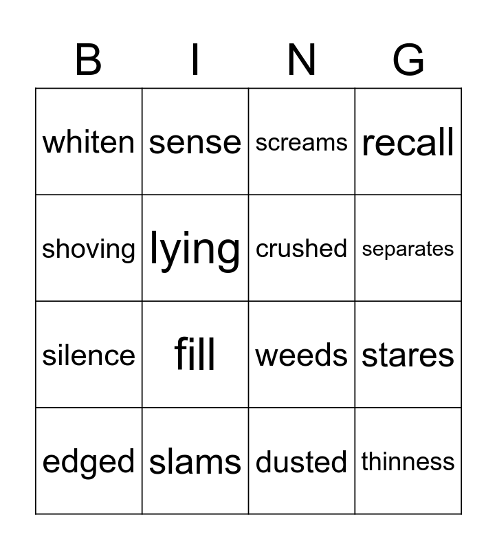 This bingo card has 27 words: Free!, refused, silence, closets, lying, screams, sense, thinness, slams, stood apart, weeds, recall, shower, roof, fill, awoke to, crushed, separates, am lost, whiten, dusted, barely, stares, edged, blinking, shoving and crime.