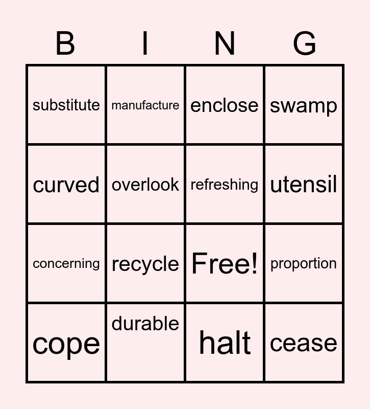 This bingo card has 22 words: durable, recycle, manufacture, proportion, overlook, refreshing, substitute, enclose, Free!, cease, concerning, swamp, purchase, cope, halt, curved, proportion, cope, recycle, curved, utensil and concerning.