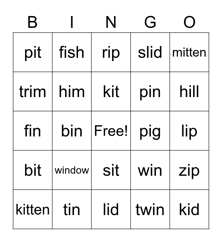 This bingo card has a free space and 24 words: window, tin, kit, kitten, mitten, pit, trim, fish, pig, sit, pin, fin, win, zip, him, twin, lip, rip, hill, bin, kid, bit, slid and lid.