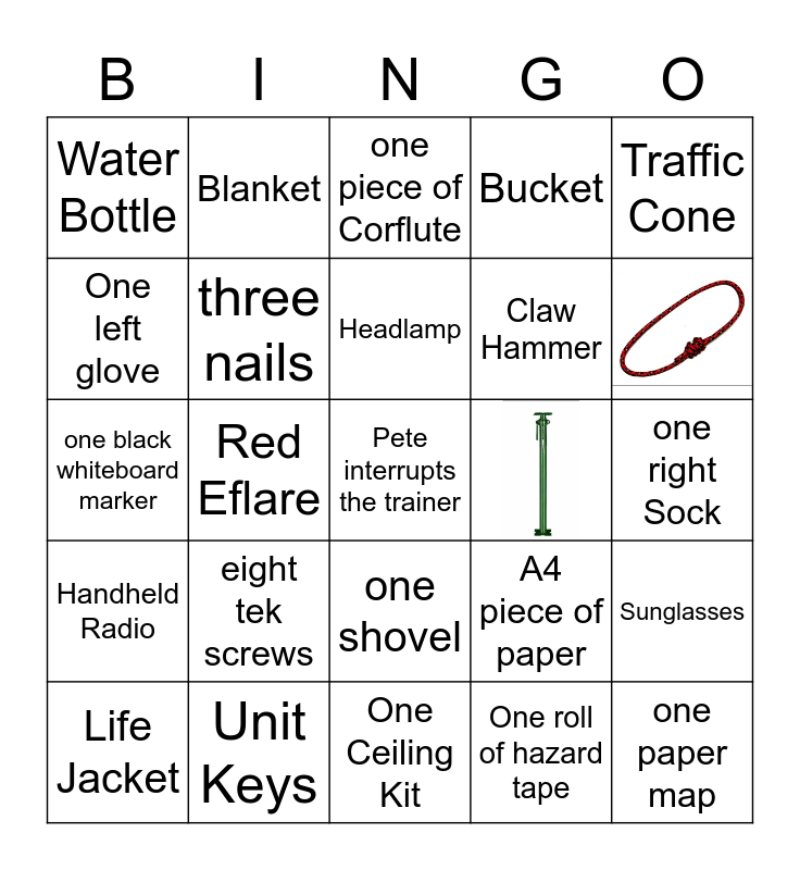 This bingo card has 4 images, a free space and 25 words: Life Jacket, Red Eflare, One Chainsaw Chaps, Water Bottle, one piece of Corflute, three nails, eight tek screws, Unit Keys, one right Sock, one paper map, One Ceiling Kit, One roll of hazard tape, one shovel, Handheld Radio, Traffic Cone, one black whiteboard marker, A4 piece of paper, Toilet Roll, Claw Hammer, One left glove, Bucket, Blanket, Sunglasses, Headlamp and Star picket basher inner.