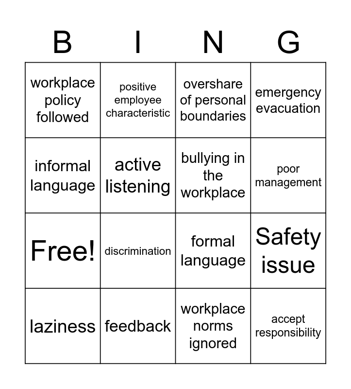 This bingo card has 20 words: Safety issue, collaboration, overshare of personal boundaries, policy referred to, laziness, informal language, feedback, workplace policy followed, Free!, positive employee characteristic, discrimination, formal language, active listening, accept responsibility, bullying in the workplace, workplace culture, poor management, emergency evacuation, workplace norms ignored and overshare of personal boundaries.