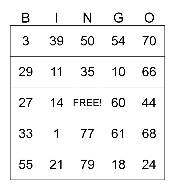 This bingo card has a free space and 24 words: 1, 21, 35, 55, 70, 3, 29, 39, 60, 77, 10, 27, 61, 68, 11, 18, 44, 50, 66, 14, 24, 33, 54 and 79.