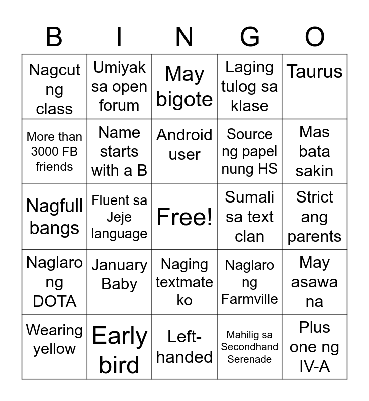 This bingo card has a free space and 24 words: January Baby, Early bird, Android user, Wearing yellow, Taurus, Nagcut ng class, More than 3000 FB friends, Umiyak sa open forum, Sumali sa text clan, Naging textmate ko, Source ng papel nung HS, Nagfull bangs, Naglaro ng Farmville, May asawa na, Name starts with a B, Mahilig sa Secondhand Serenade, Strict ang parents, May bigote, Mas bata sakin, Fluent sa Jeje language, Plus one ng IV-A, Naglaro ng DOTA, Laging tulog sa klase and Left-handed.