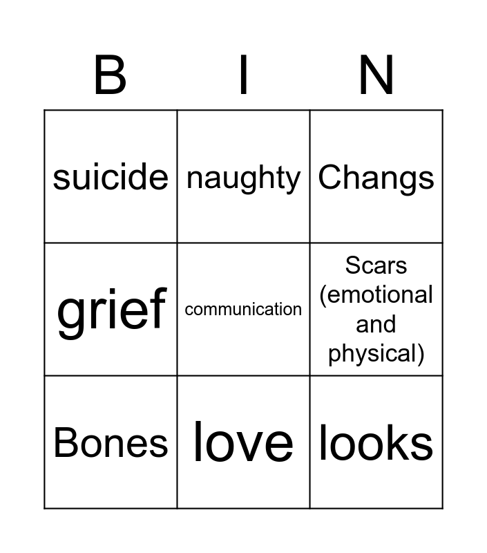 This bingo card has a free space and 8 words: Scars (emotional and physical), Changs, naughty, Bones, suicide, looks, grief and love.