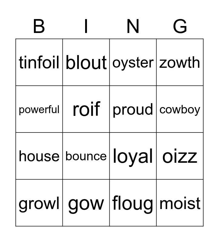 This bingo card has 24 words: spoilt, pound, cowboy, outside, powerful, tinfoil, roif, blout, gow, joyfil, house, loyal, snoy, crown, proud, soil, floug, oyster, bounce, oizz, growl, moist, zowth and thoy.