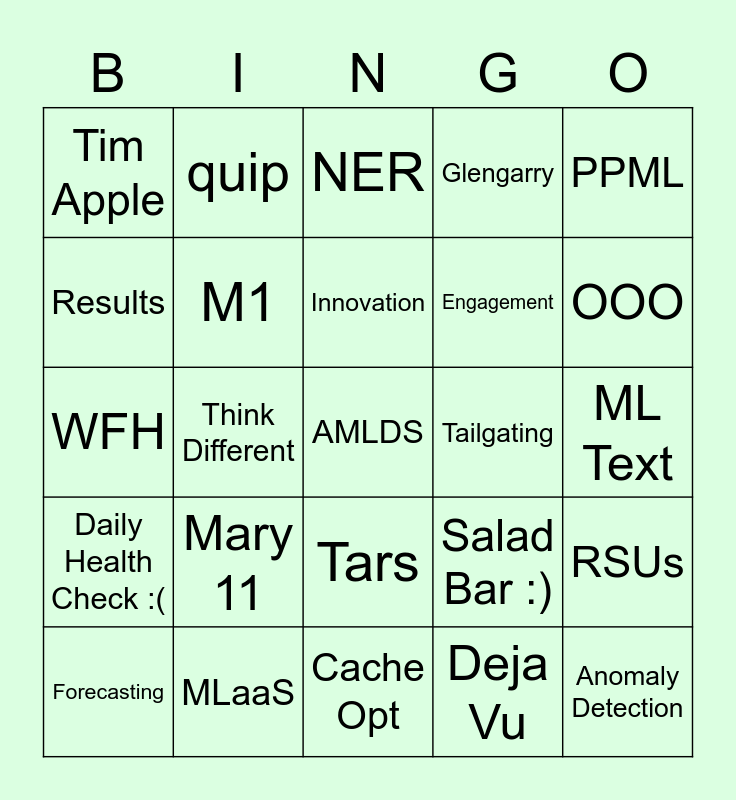 This bingo card has a free space and 44 words: Quinn & Parth, Anomaly Detection, Change Detection, Forecasting, Causal Discovery, Deja Vu, NER, Doc AI, PPML, MLaaS, Glengarry, Tailgating, Tars, Mary 11, good, good, good, Cache Opt, Captain Jack, WFH, In Office, OOO, quip, slack me, ITDPs, Tim Apple, Machine Learning, ML Text, ML Timeseries, ML Vision, Salad Bar :), Daily Health Check :(, Sunnyvale, RSUs, Yearly Evaluation, Publications, Think Different, Operationalize AI for Enterprise Applications, iCal, Teamwork, Innovation, Results, Engagement, Austin (Texas), M1 and Automation.