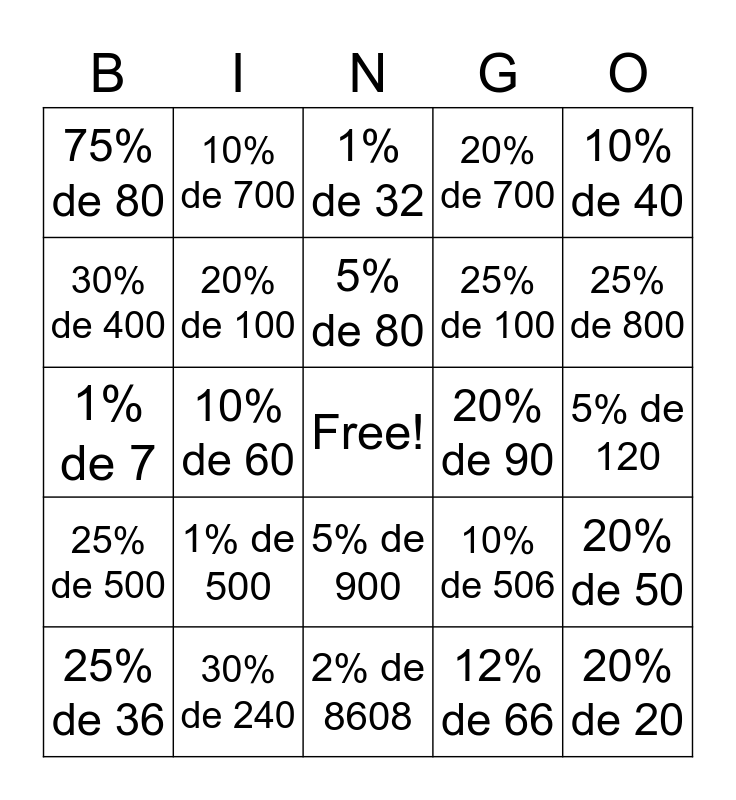 This bingo card has a free space and 24 words: 1% de 500, 30% de 240, 5% de 80, 25% de 36, 10% de 40, 75% de 80, 30% de 400, 10% de 700, 20% de 90, 5% de 900, 25% de 100, 1% de 7, 10% de 506, 20% de 50, 20% de 100, 12% de 66, 5% de 120, 1% de 32, 25% de 800, 10% de 60, 20% de 20, 25% de 500, 20% de 700 and 2% de 8608.
