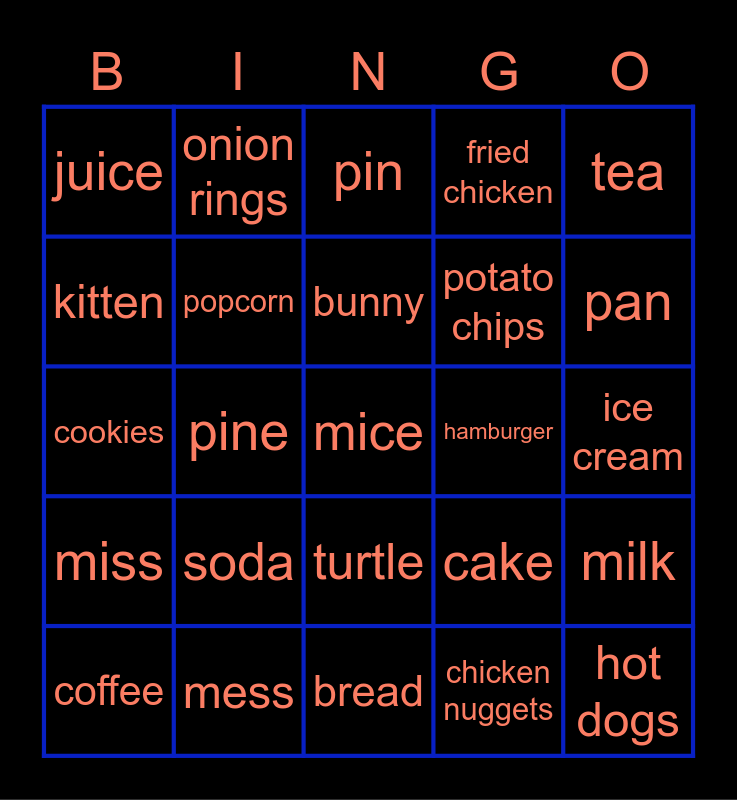 This bingo card has 25 words: soda, bread, bunny, coffee, tea, juice, kitten, onion rings, hamburger, turtle, potato chips, cookies, cake, milk, popcorn, hot dogs, ice cream, pin, pan, pine, mice, mess, miss, fried chicken and chicken nuggets.
