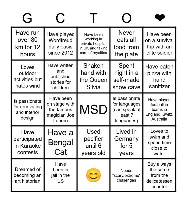 This bingo card has a free space and 24 words: Have a Bengal Cat, Have been in jail in the US, Shaken hand with the Queen Silvia, Dreamed of becoming an art historian, Have been on a survival trip with an elite soldier, Have run over 80 km for 12 hours, Loves outdoor activities but hates wind, Have played Wordfreud daily basis since 2012, Is passionate for languages (can speak at least 7 languages), Used pacifier until 6 years old, Spent night in a self-made snow cave, Is passionate for renovating and interior design, Lived in Germany for 5 years, Loves to swim and spend time close to water, Have written and published stories for children, Needs "scary/extreme" challenges, Have played football in teams in England, Switz, Australia, Have been working in private hospital in UK and taking care of royalties, Have eaten pizza with hand sanitizer, Have been on stage with the famous magician Joe Labero, Buy always the same from the delicatessen counter, Have participated in Karaoke contests, Never eats all food from the plate and 😊.