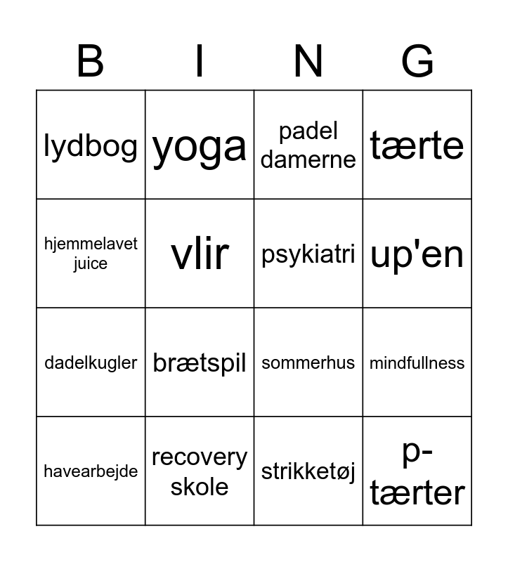 This bingo card has 16 words: recovery skole, mindfullness, padel damerne, lydbog, dadelkugler, yoga, sommerhus, strikketøj, hjemmelavet juice, vlir, havearbejde, tærte, brætspil, up'en, psykiatri and p-tærter.
