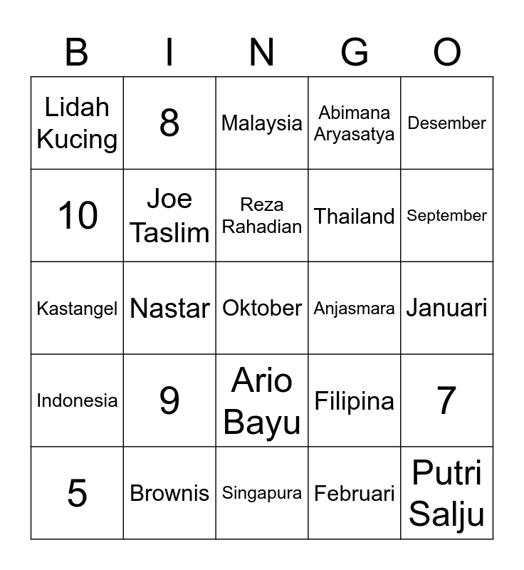 This bingo card has 25 words: Indonesia, Brownis, Oktober, Februari, Desember, Lidah Kucing, 8, Malaysia, Anjasmara, 7, 10, Joe Taslim, Singapura, Filipina, September, 5, Nastar, Reza Rahadian, Thailand, Januari, Kastangel, 9, Ario Bayu, Abimana Aryasatya and Putri Salju.