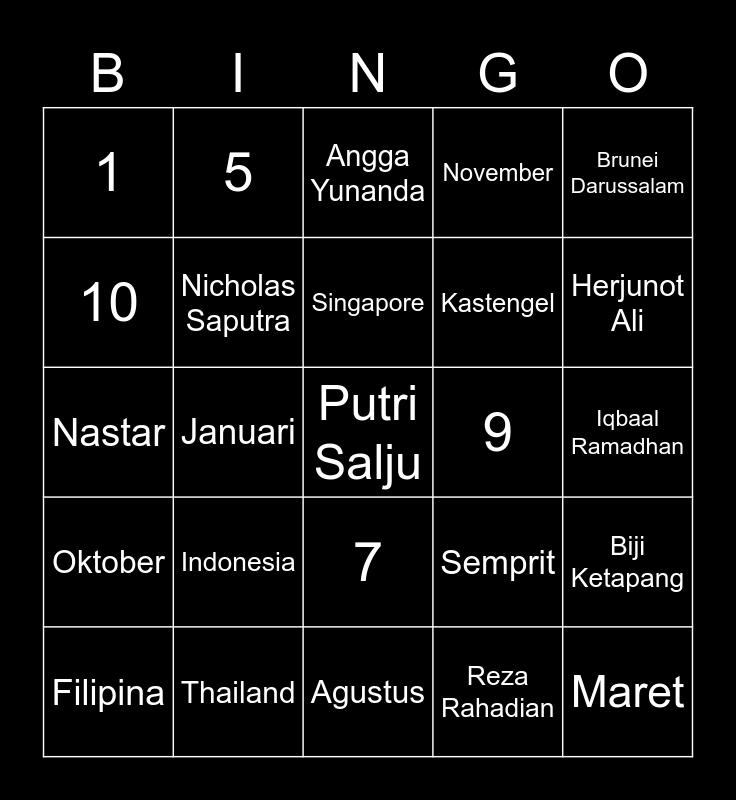 This bingo card has a free space and 24 words: Indonesia, Thailand, Singapore, Filipina, Brunei Darussalam, 1, 10, 5, 9, 7, Kastengel, Nastar, Semprit, Biji Ketapang, Nicholas Saputra, Reza Rahadian, Iqbaal Ramadhan, Angga Yunanda, Herjunot Ali, Januari, Maret, Oktober, November and Agustus.