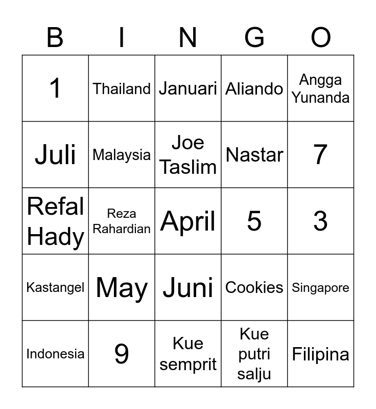 This bingo card has a free space and 24 words: May, 9, Joe Taslim, Indonesia, Angga Yunanda, 1, Juli, Thailand, 5, Juni, Nastar, Refal Hady, Cookies, Singapore, Malaysia, Kue putri salju, 3, Januari, 7, Reza Rahardian, Filipina, Kastangel, Aliando and Kue semprit.