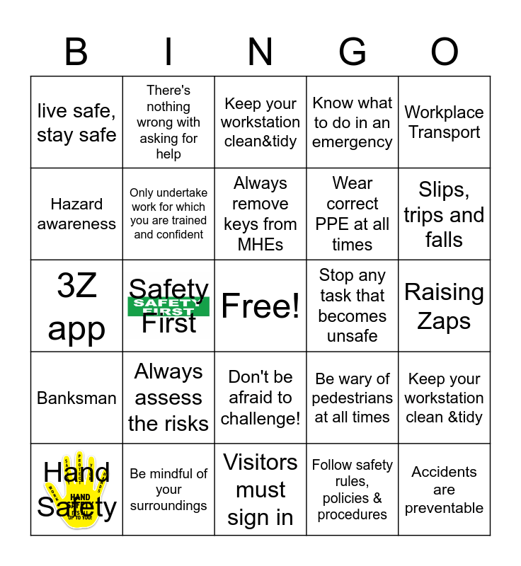 This bingo card has 3 images, a free space and 29 words: Hand Safety, Think Safe, Safety First, Safety shoes, live safe, stay safe, Keep your workstation clean&tidy, Only undertake work for which you are trained and confident, Always assess the risks, Stop any task that becomes unsafe, Be mindful of your surroundings, Raising Zaps, Accidents are preventable, Visitors must sign in, Follow safety rules, policies & procedures, Slips, trips and falls, Always perform daily MHE inspections before use, Don't be afraid to challenge!, Banksman, Workplace Transport, 3Z app, Be wary of pedestrians at all times, Working conditions, Wear correct PPE at all times, Hazard awareness, Know what to do in an emergency, There's nothing wrong with asking for help, Keep your workstation clean &tidy, Always remove keys from MHEs and Always escalate damage.