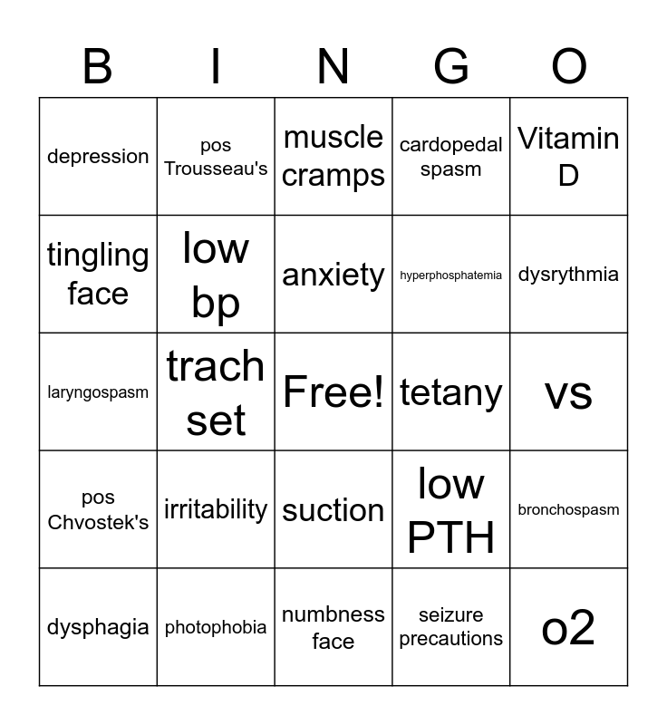 This bingo card has a free space and 27 words: low PTH, hypocalcemia, hyperphosphatemia, numbness face, tingling face, muscle cramps, pos Trousseau's, pos Chvostek's, tetany, bronchospasm, laryngospasm, cardopedal spasm, dysphagia, photophobia, dysrythmia, seizure, low bp, anxiety, irritability, depression, vs, seizure precautions, trach set, o2, suction, Vitamin D and PO4 binders.