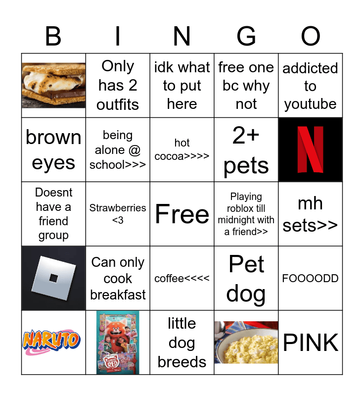 This bingo card has 6 images, a free space and 18 words: Can only cook breakfast, hot cocoa>>>>, addicted to youtube, brown eyes, Only has 2 outfits, Playing roblox till midnight with a friend>>, coffee<<<<, 2+ pets, Doesnt have a friend group, Pet dog, FOOOODD, being alone @ school>>>, mh sets>>, idk what to put here, Strawberries <3, PINK, free one bc why not and little dog breeds.