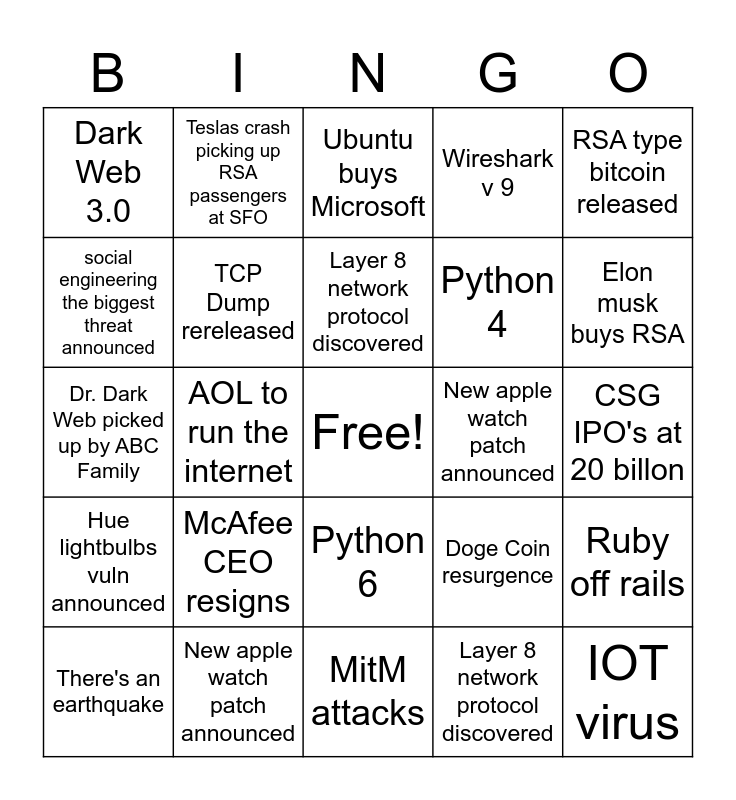 This bingo card has a free space and 24 words: McAfee CEO resigns, New apple watch patch announced, Layer 8 network protocol discovered, There's an earthquake, RSA type bitcoin released, Dark Web 3.0, social engineering the biggest threat announced, Teslas crash picking up RSA passengers at SFO, New apple watch patch announced, Python 6, Python 4, Dr. Dark Web picked up by ABC Family, Doge Coin resurgence, Ruby off rails, TCP Dump rereleased, Layer 8 network protocol discovered, CSG IPO's at 20 billon, Ubuntu buys Microsoft, Elon musk buys RSA, AOL to run the internet, IOT virus, Hue lightbulbs vuln announced, Wireshark v 9 and MitM attacks.