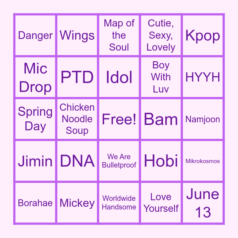 This bingo card has a free space and 45 words: 9 Years, June 13, Army, Borahae, Life Goes On, Love Yourself, Map of the Soul, South Korea, Kpop, Mickey, Cutie, Sexy, Lovely, Bam, We Are Bulletproof, DNA, Rap Monster, Worldwide Handsome, AgustD, Spring Day, Dope, HYYH, Wings, Fire, Boy In Luv, Danger, Taehyung, Namjoon, Jin, Yoongi, Hobi, Jimin, Jungkook, Mikrokosmos, Min Holly, Museums, Eat Jin, Chicken Noodle Soup, Mochi, Yeontan, Golden Maknae, Idol, Mic Drop, Boy With Luv, Butter, PTD and Dynamite.